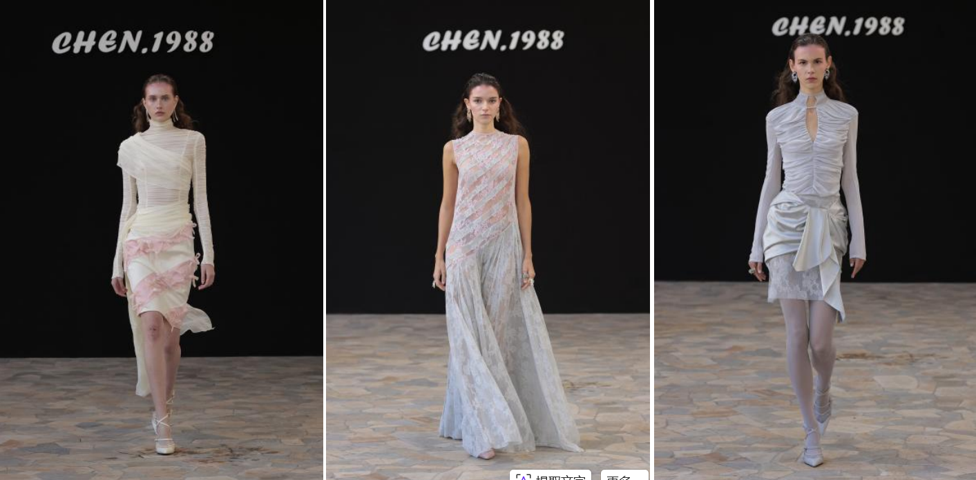 鐘楼の鐘の音が暗い屋根の上を響き渡る中、最近「ゴールデンクラウン賞」を受賞した陳龍による「秋の理想」ショーケースがロマンティックに幕を開けた。廊下の床タイルは夕暮れと舞台照明を反射し、モデルのスカートのピンクのグラデーションと絡み合っていた。手作業でビーズをあしらったリボンは、歩くたびに優しく揺れ、レースとレーザーカットのディテールで作られた立体的なテクスチャーが柱の間を光と影で彩っていた。肩のデザインのシャープなシルエットは、遠くに見える時計塔のクラシックなラインを彷彿とさせた。陳龍は「秋」を詩に用い、単なる表現を超え、柔らかなピンクとチャコールグレーの衝突、繊細な紗とシャープなカットアウトの相互作用を用いて、歩くリズムを通して女性の穏やかでありながら豊かな内面世界を描き出しました。シースルーのネックラインのギャザーディテールは伝統的なエレガンスの境界を打ち破り、パフスカートは現代的なシルエットと融合し、歩くたびにリラックスして自信に満ちた東洋の美的態度を伝え、気楽さと鮮やかなデザインの緊張感の両方を醸し出し、現代中国デザインならではの魅力を披露しました。
