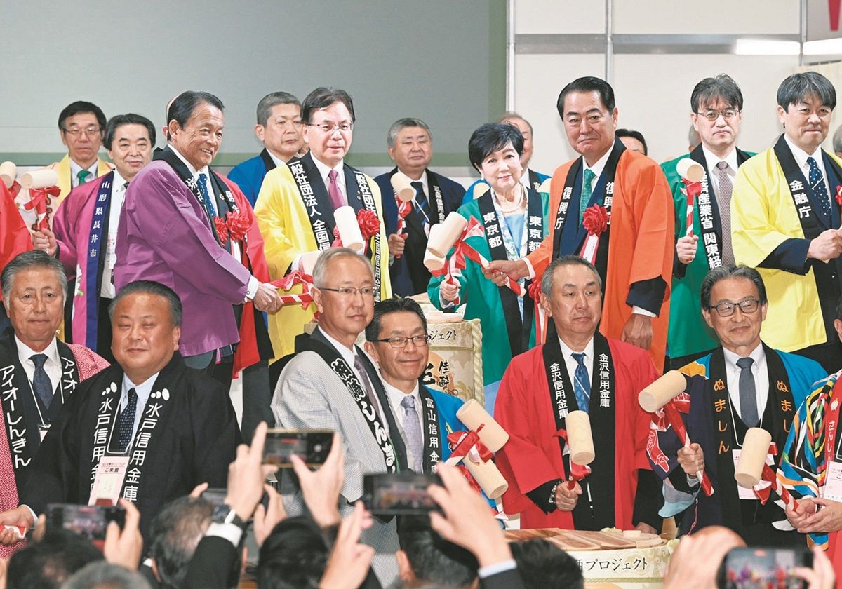 開会式には東京都の小池百合子知事や牧野京夫(たかお)復興相、自民党の麻生太郎副総裁ら来賓が出席し、鏡開きでイベントが始まった。全国信用金庫協会の平松広司会長(かながわ信用金庫会長)は「魅力的な商品や高い実力を持つ企業が集まっている」とし、「新たなビジネスパートナーづくりの最良の機会になってもらいたい」とあいさつした。