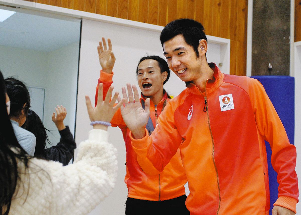 先月開催された東京デフリンピックに陸上競技で出場した2選手が5日、板橋区立舟渡小学校を訪れ、4年生約80人に大会の報告をし、陸上教室を開いた。男子400メートルリレー金メダル、100メートル銅メダルの佐々木琢磨選手(32)=仙台大職員=と、男子1万メートル6位、マラソン7位の青山拓朗選手(29)=台東区職員=で、大会後初めて子どもたちの前に立ち、一緒に体を動かして交流した。(神谷円香)