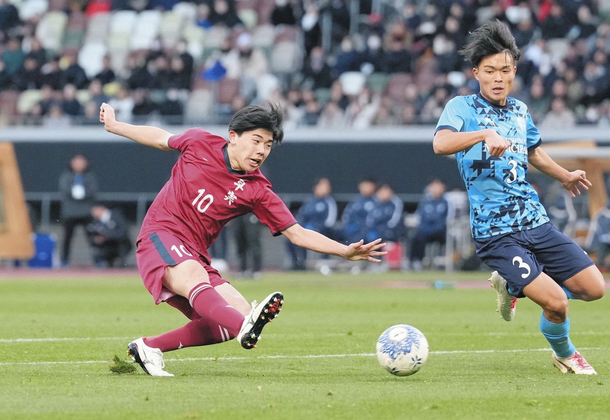 早実-徳島市立後半、ゴールを決める早実・霜田(左)=国立競技場で(木戸佑撮影)