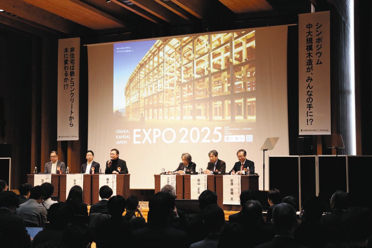 大阪・関西万博で木造の大屋根リングを手がけた建築家の藤本壮介さんらが登壇。林業と連携した循環型社会の実現や地域産業の振興と地域活性化を後押しするための木造建築の必要性などを説明、意見を交わした。