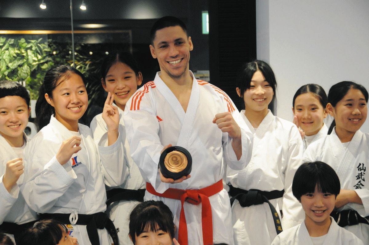 2021年東京五輪の空手男子組手75キロ級で銅メダルに輝いたウクライナのスタニスラフ・ホルナさん(37)が、ロシアの侵攻を受ける母国支援のためオークションに出品したメダルが、落札した日本人から返還された。今月5日、東京都内の空手道場で子どもたちからメダルを受け取ったホルナさんは「大きくなった息子に見せられるのがうれしい」とはにかんだ。(山口登史)