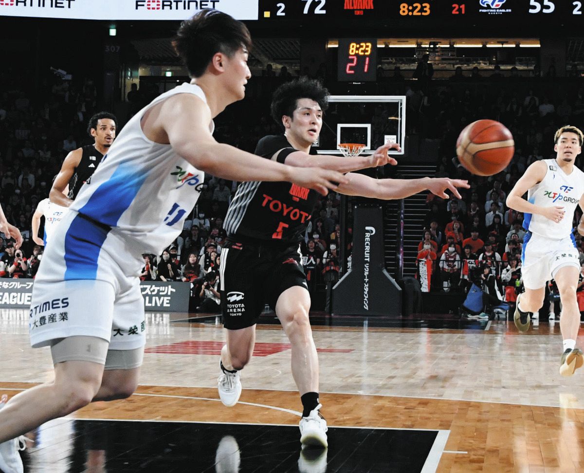 Bリーグ1部(B1)アルバルク東京(A東京)は22日、トヨタアリーナ東京でファイティングイーグルス名古屋(FE名古屋)に92-71と快勝した。一時、7点差に迫られるも安藤周人が3本の3点シュートを沈め、流れを引き寄せた。突き放して第4クオーター(Q)終盤、今季限りで引退する菊地祥平をコートに立たせることに成功。ファンを熱狂させた。