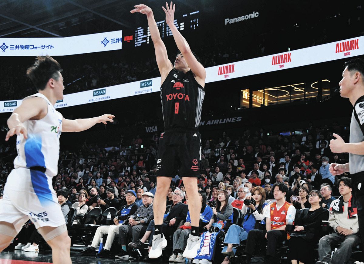 A東京-FE名古屋第4クオーター、3点シュートを沈めるA東京の安藤(中)=トヨタアリーナ東京で(渡辺陽太郎撮影)